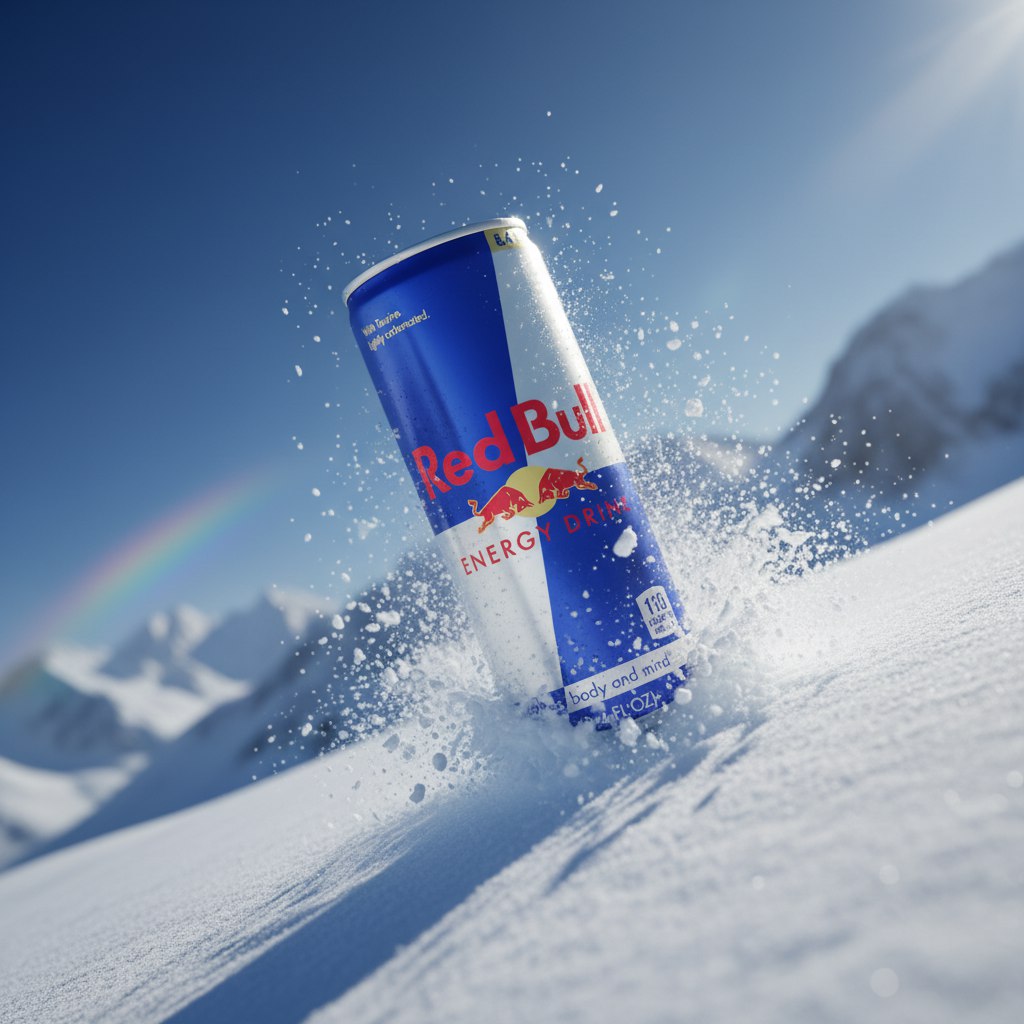 Create an ultra realistic 4K vertical1:1 image featuring the uploaded product photo positioned diagonally across the frame, suspended in mid-air with dynamic forward motion. Reproduce the same deep navy background with a soft radial glow behind the product, maintaining the smooth gradient falloff and clean studio atmosphere. Match the bright, cool-toned spotlight illuminating the product from the upper left, creating crisp highlights, saturated reflections, and glossy specular accents across all materials while preserving accurate color temperature. Add a more pronounced water environment in the background by increasing the volume of splashing water, wide curved arcs, secondary splash layers, and fine floating mist, all subtly blurred to preserve depth while enhancing the dynamic energy of the composition. Surround the product with splashing water droplets and dynamic floating elements created exclusively from the product’s own energy drinks, dynamically synced with the product’s real contents, ensuring realistic motion blur variation, refraction, translucency, crumb texture, and depth separation. Keep the liquid splash wrapped around the product with high-energy curvature, sharp edges, micro-bubbles, and detailed water-like fluid behavior matching the lighting direction and shadow pattern. Ensure the inserted product retains its exact authentic shape, proportions, scale, materials, textures, finishes, labels, and all printed details perfectly sharp, legible, and unchanged. Integrate the product naturally with accurate occlusion, correct refraction through water, realistic shadow softness, subtle light bounce, and consistent environmental color harmony. Maintain the shallow depth of field, high-contrast cinematic mood, and vibrant blue atmosphere of the reference. Render in ultra realistic quality, 4K resolution, 1:1format.